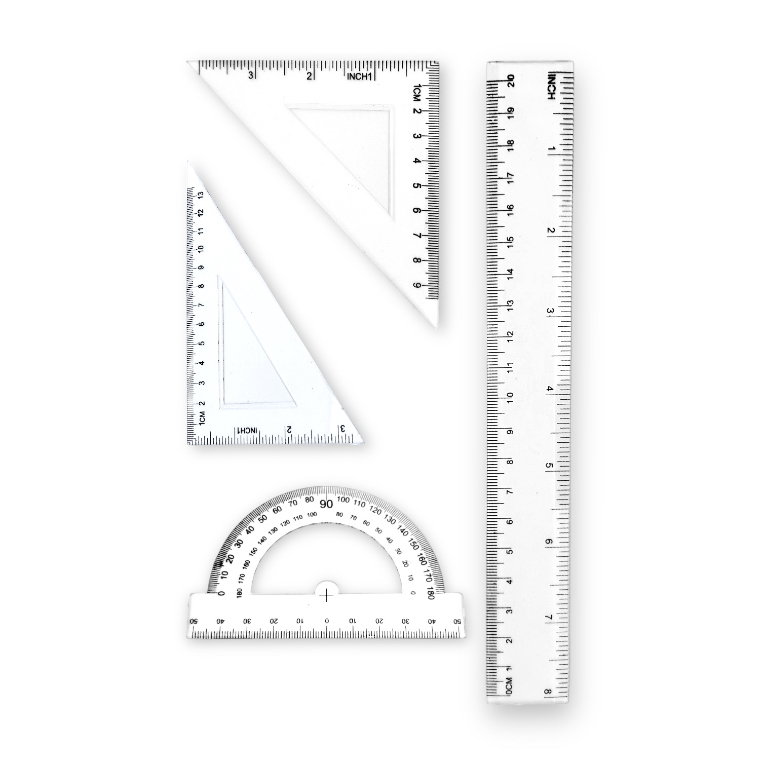 Contiene: regla 20 cm, escuadra 45°, escuadra 30°60° y semicírculo